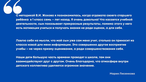 «Дети учатся не только побеждать, но и справляться с неудачами», – впечатления родителей, которые провели самый первый год по системе Жохова, всегда самые яркие и очень точные. Благодарность родителей – большая ценность и одновременно кредит доверия для дальнейшей работы.
